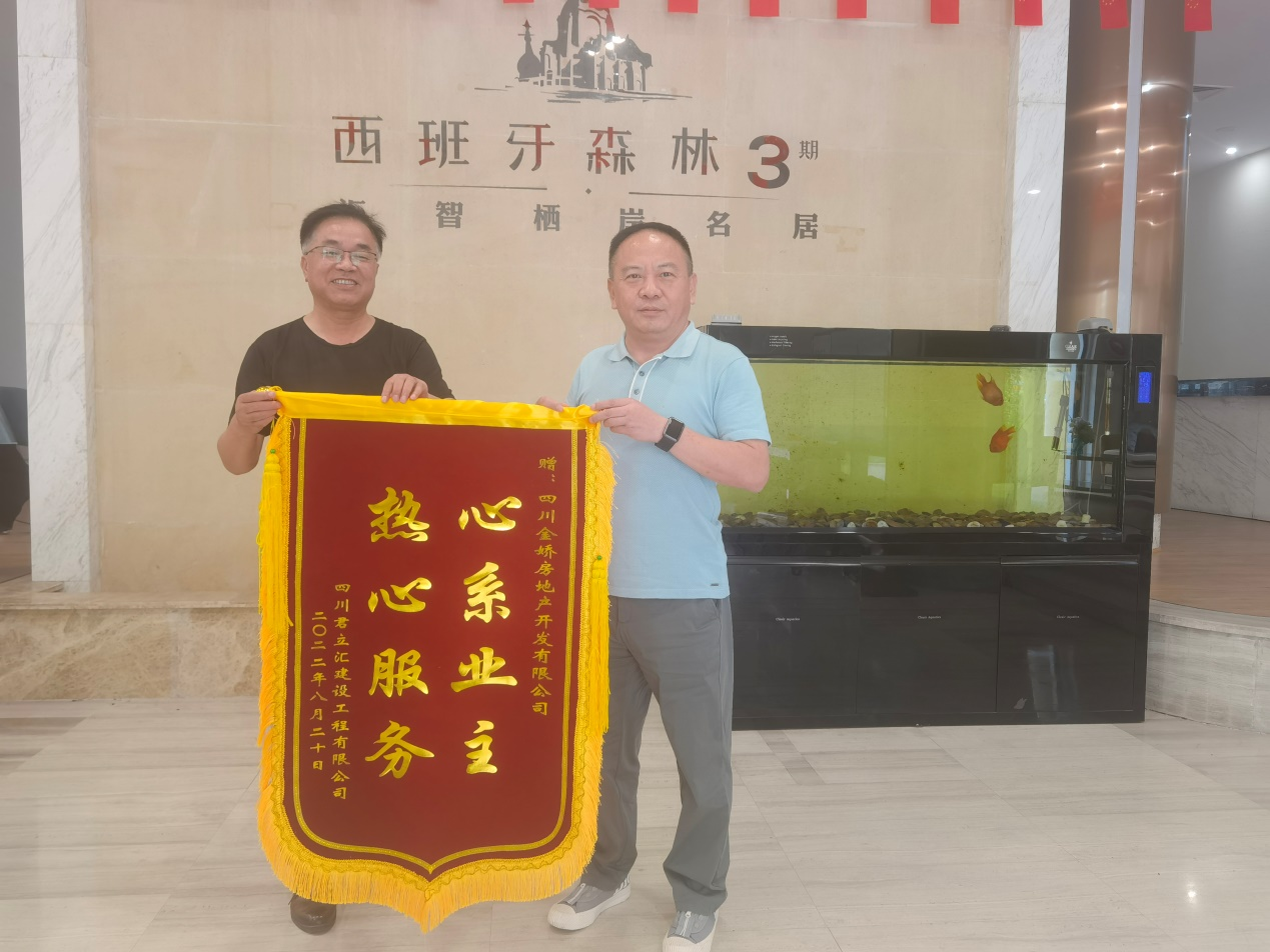 8月30日,四川能投新城公司所屬金嬌公司匯智棲岸民居項目商鋪租戶代表將“心系業主 熱心服務”錦旗送至金嬌公司,以此表達對金嬌公司在新冠疫情期間主動為商鋪租戶減免租金貼心、暖心之舉的由衷地感謝。金嬌公司黨支部書記、執行董事、總經理李威代表公司接受錦旗。
